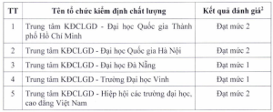 Cụ thể, 5 tổ chức kiểm định chất lượng giáo dục công lập gồm: Trung tâm Kiểm định chất lượng giáo dục – Đại học Quốc gia Hà Nội (2013); Trung tâm Kiểm định chất lượng giáo dục – Đại học Quốc gia Thành phố Hồ Chí Minh (2013); Trung tâm Kiểm định chất lượng giáo dục – Đại học Đà Nẵng (2015); Trung tâm Kiểm định chất lượng giáo dục – Hiệp hội Các trường đại học, cao đẳng Việt Nam (2015); Trung tâm Kiểm định chất lượng giáo dục – Trường Đại học Vinh (2017).